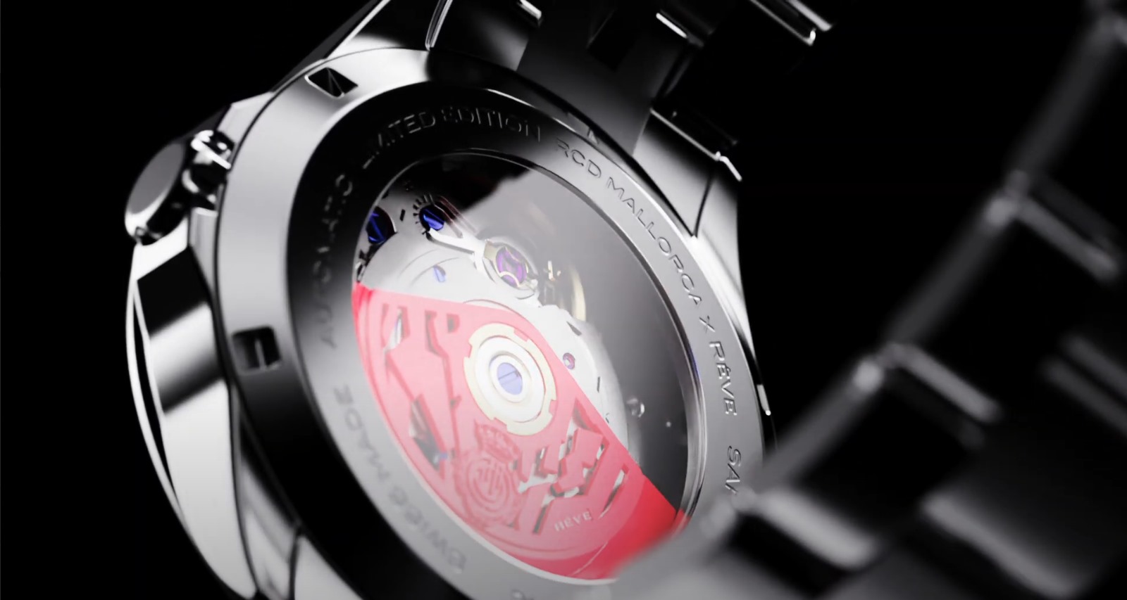 The watch features a rotor exclusively designed for RCD Mallorca fans. Not only is it engraved, but it has been entirely conceptualized and crafted to reflect the club’s essence, with a vibrant red finish highlighting Mallorca’s passion and identity. Each movement of the watch brings the rotor to life, a dynamic tribute to the team’s enduring legacy.